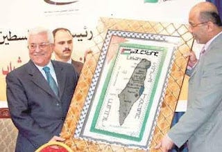 Please look closely at this map, being held up by Holocaust-denier/Munich Massacre-funder, "President" of the Pseudostinians, Mahmud Abbas (left).